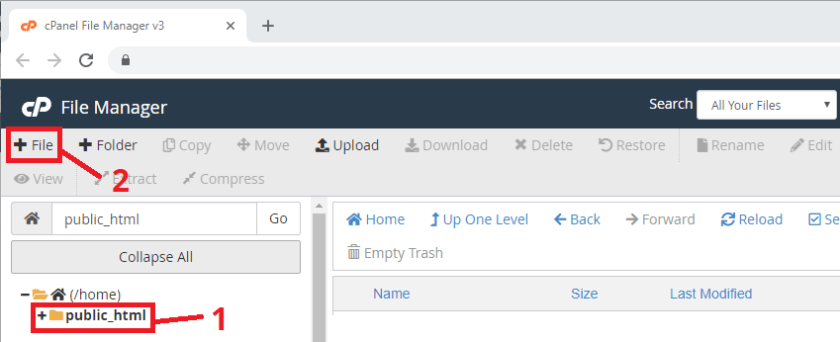 Then, select the public_html option and press the “+ File” button to create a new .php file.