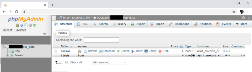 After that, you should see your newly created table called Sensor in the example_esp_data database as shown in the figure below: